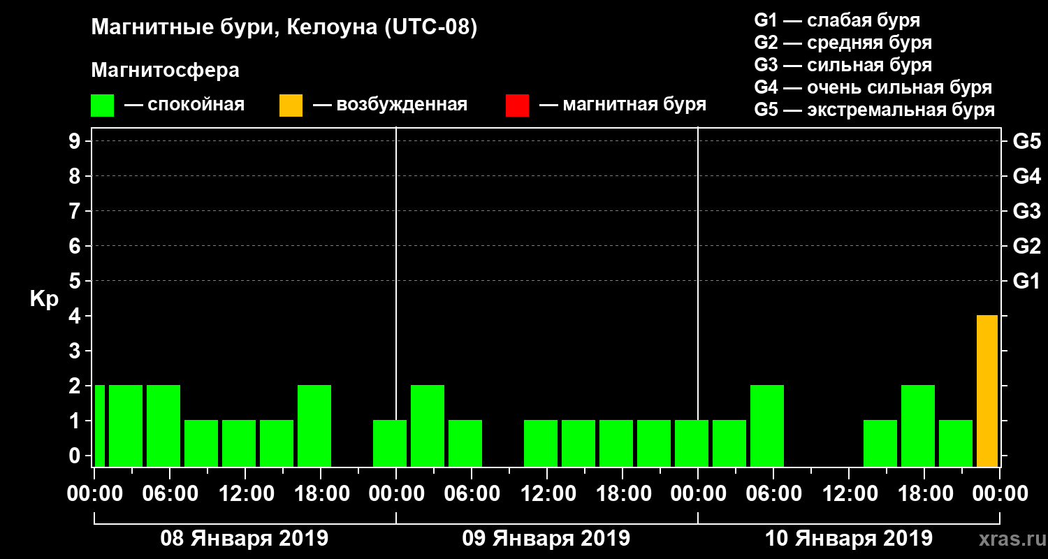 Изменения геомагнитного индекса Kp с 8 по 10 января 2019 года для средних широт