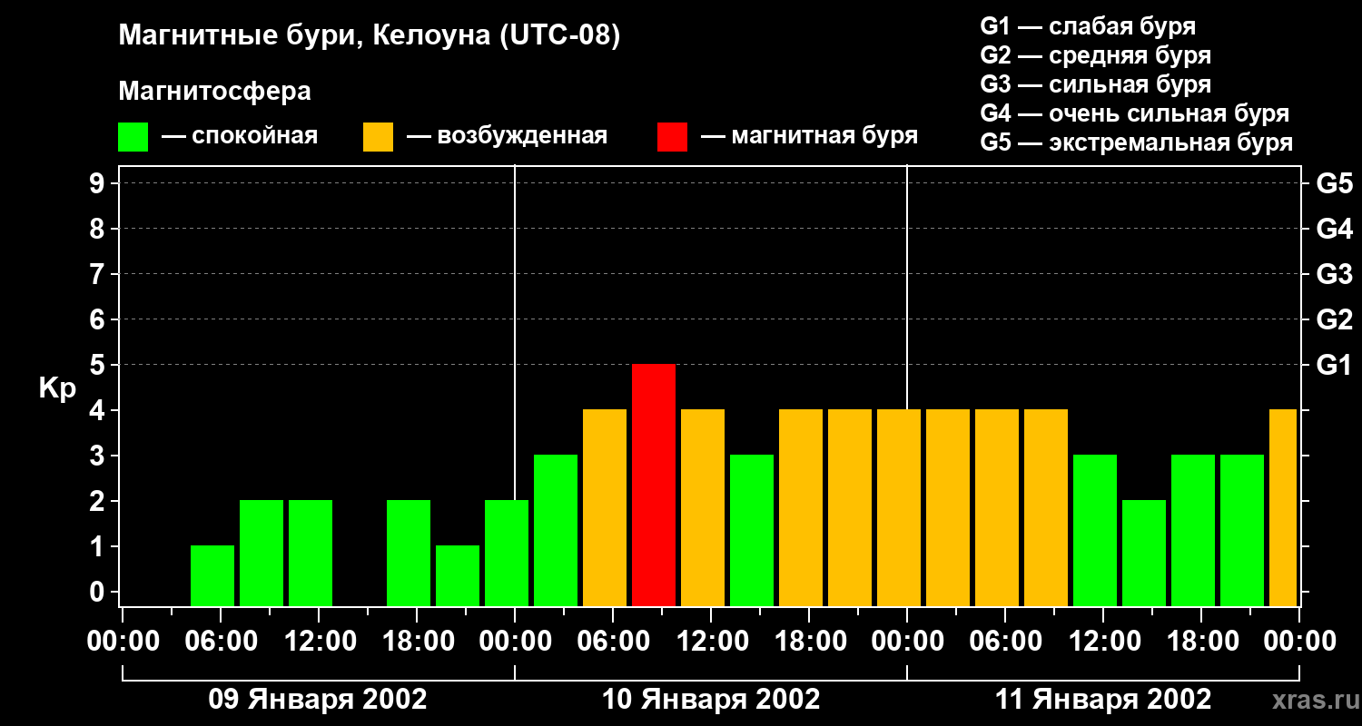 Изменения геомагнитного индекса Kp с 9 по 11 января 2002 года для средних широт