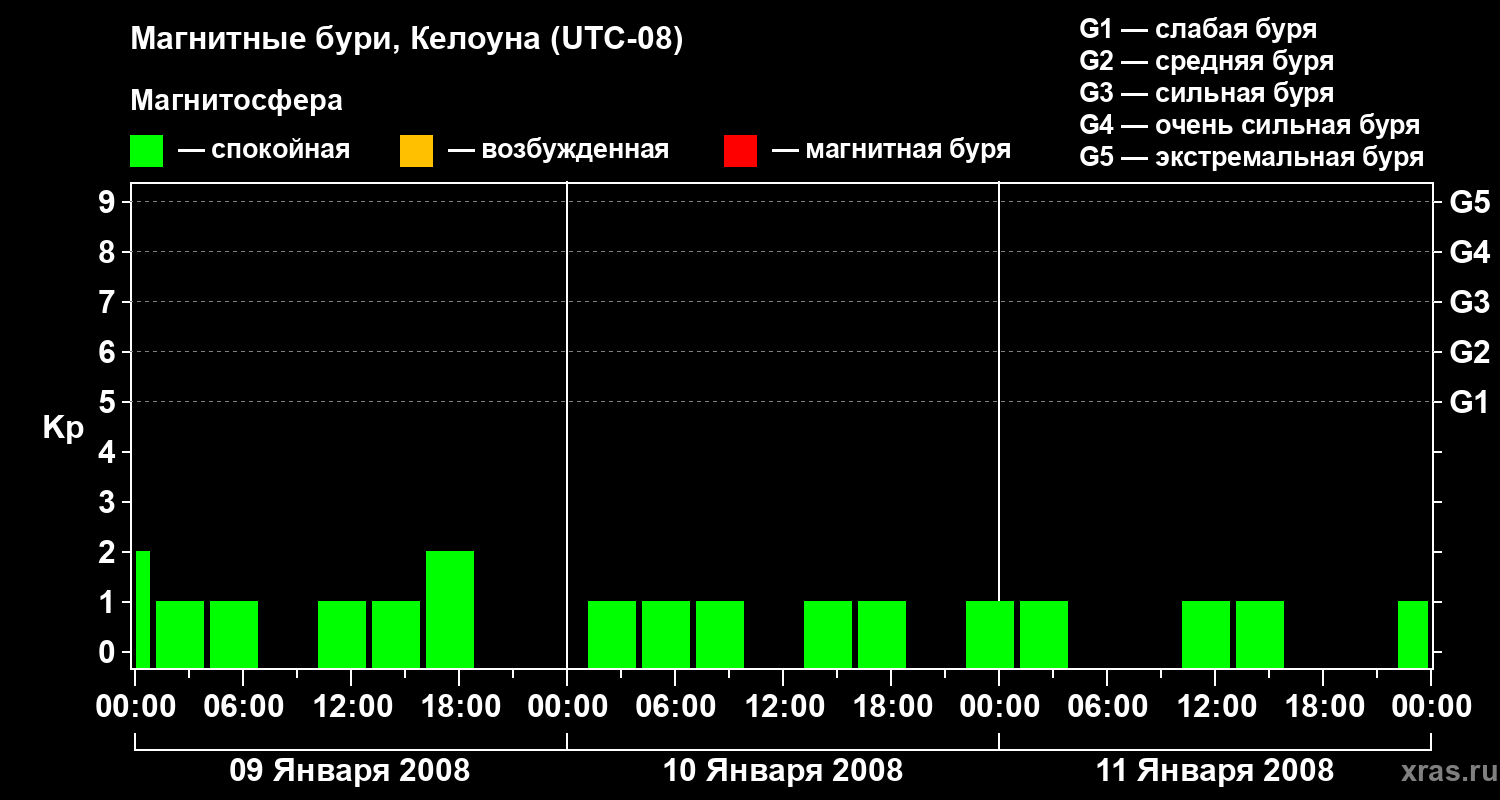 Изменения геомагнитного индекса Kp с 9 по 11 января 2008 года для средних широт