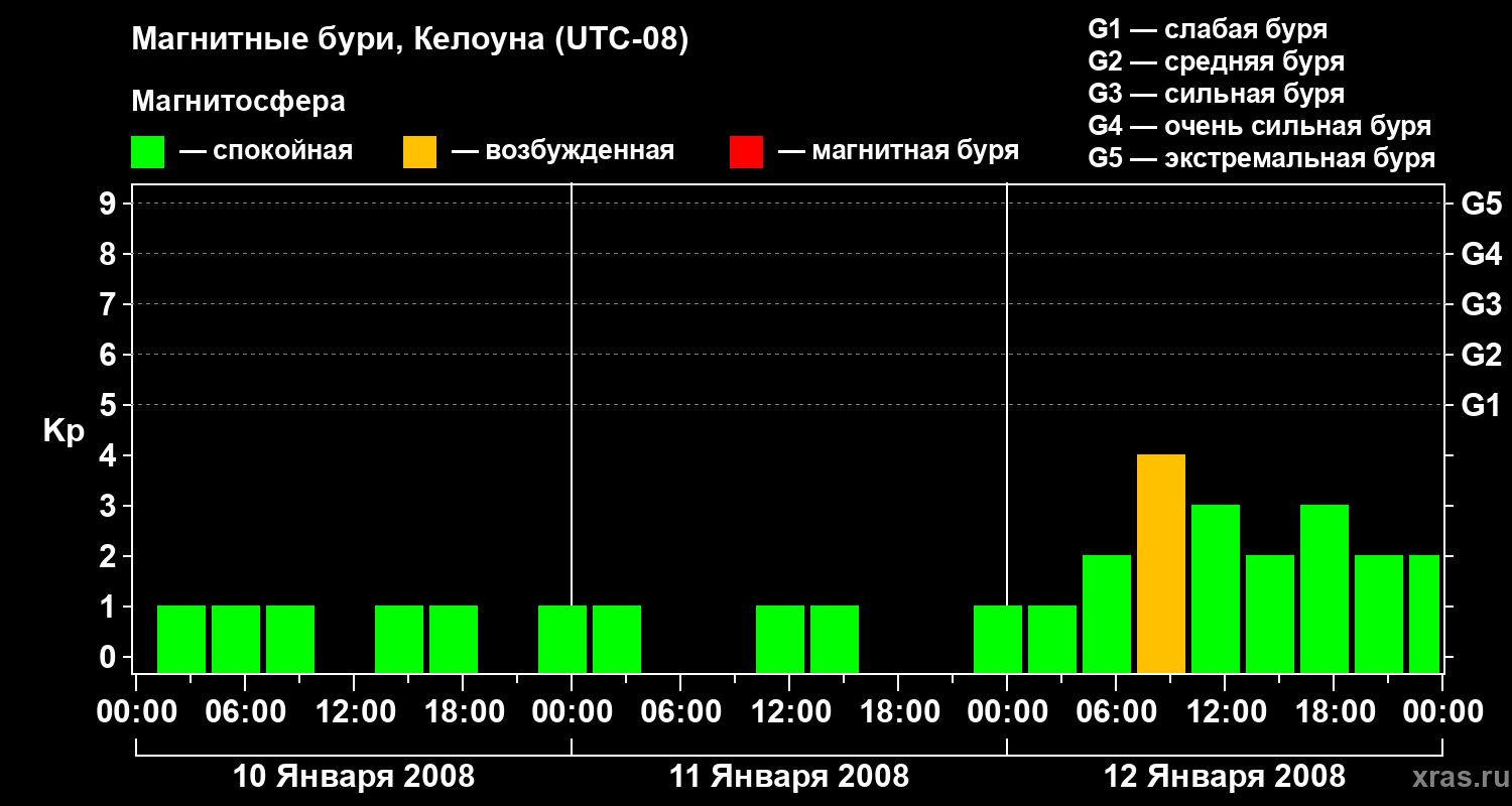 Изменения геомагнитного индекса Kp с 10 по 12 января 2008 года для средних широт