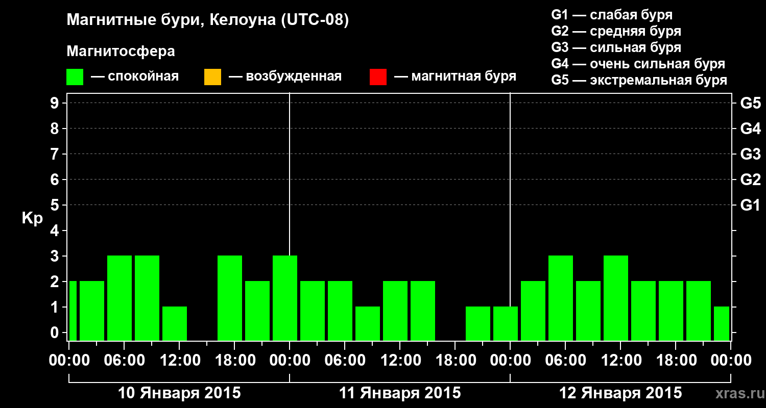 Изменения геомагнитного индекса Kp с 10 по 12 января 2015 года для средних широт