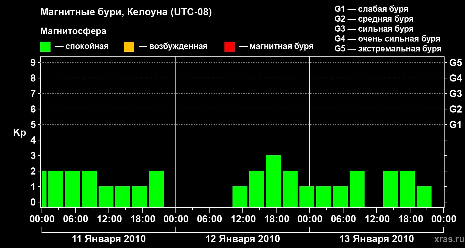 Изменения геомагнитного индекса Kp с 11 по 13 января 2010 года для средних широт