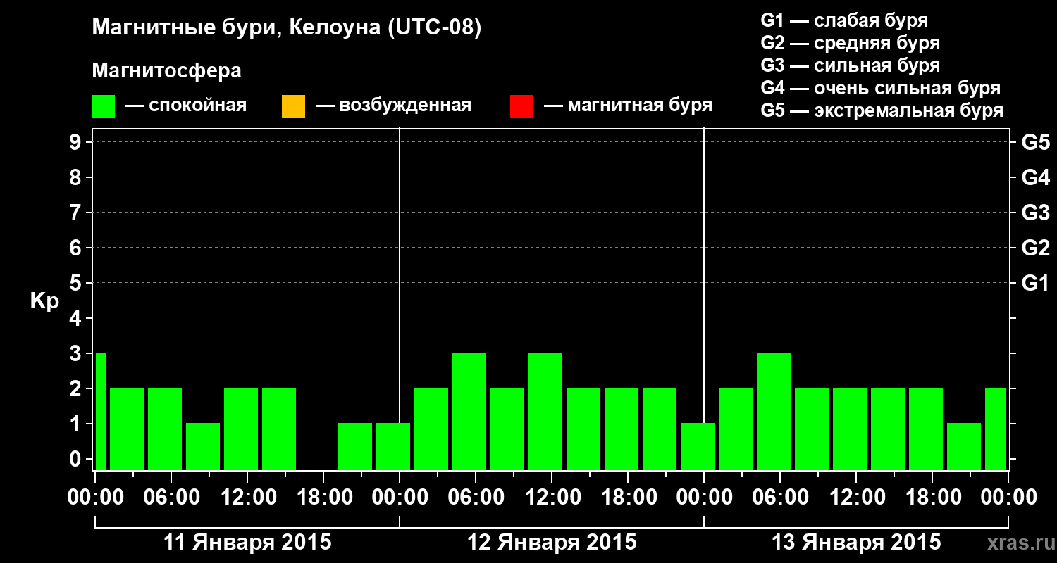 Изменения геомагнитного индекса Kp с 11 по 13 января 2015 года для средних широт