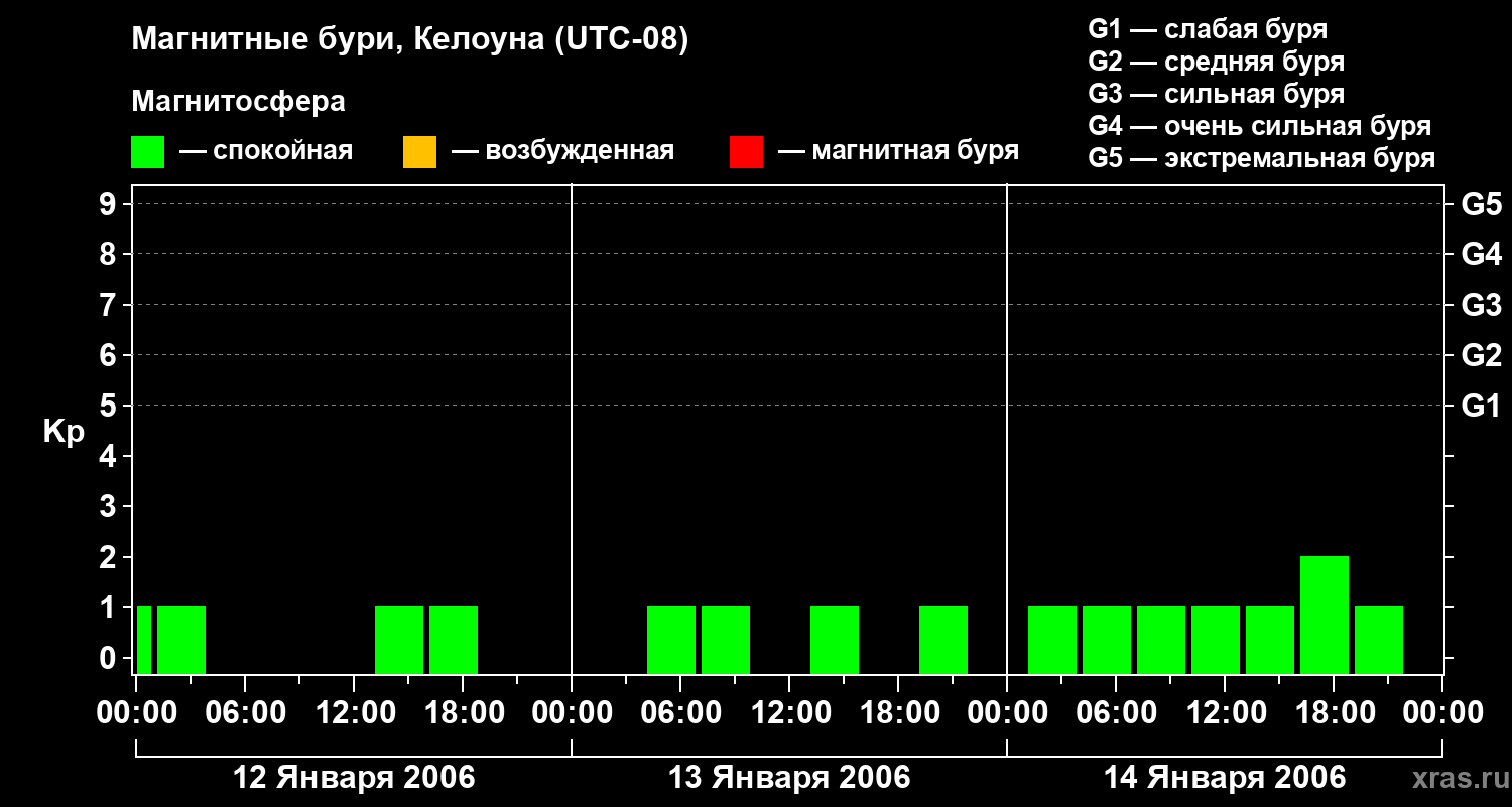 Изменения геомагнитного индекса Kp с 12 по 14 января 2006 года для средних широт