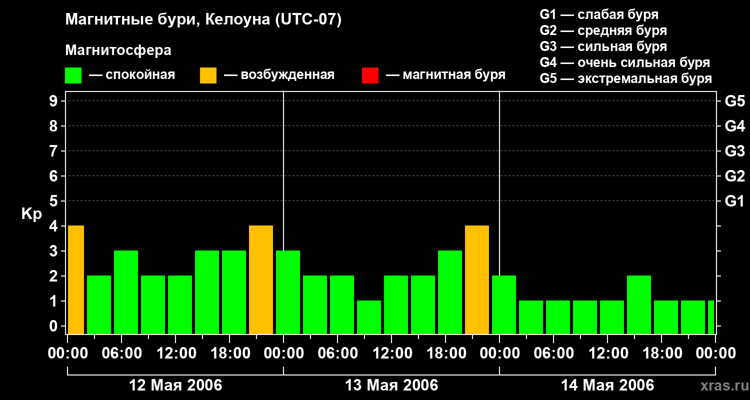 Изменения геомагнитного индекса Kp с 12 по 14 мая 2006 года для средних широт