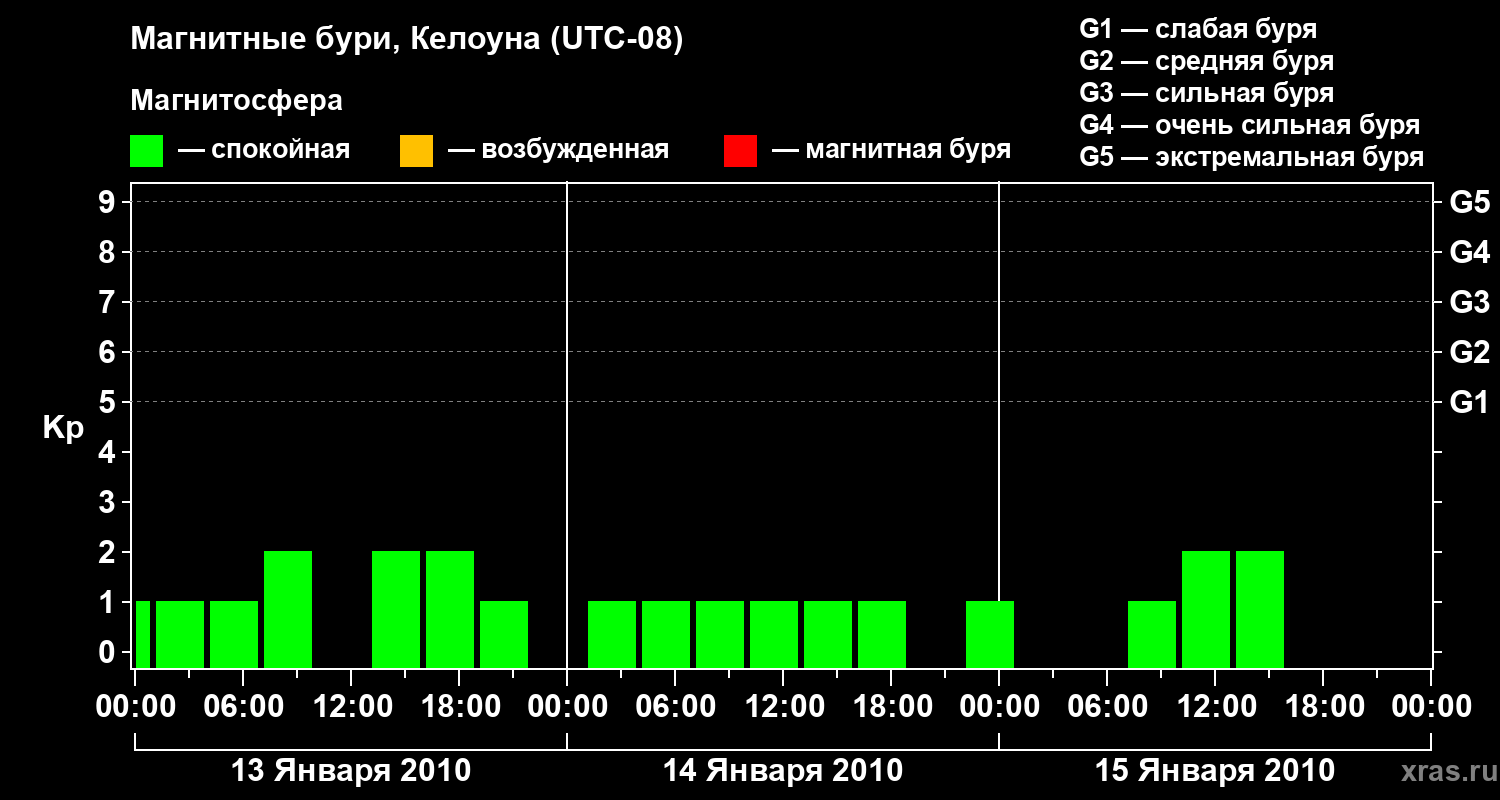 Изменения геомагнитного индекса Kp с 13 по 15 января 2010 года для средних широт