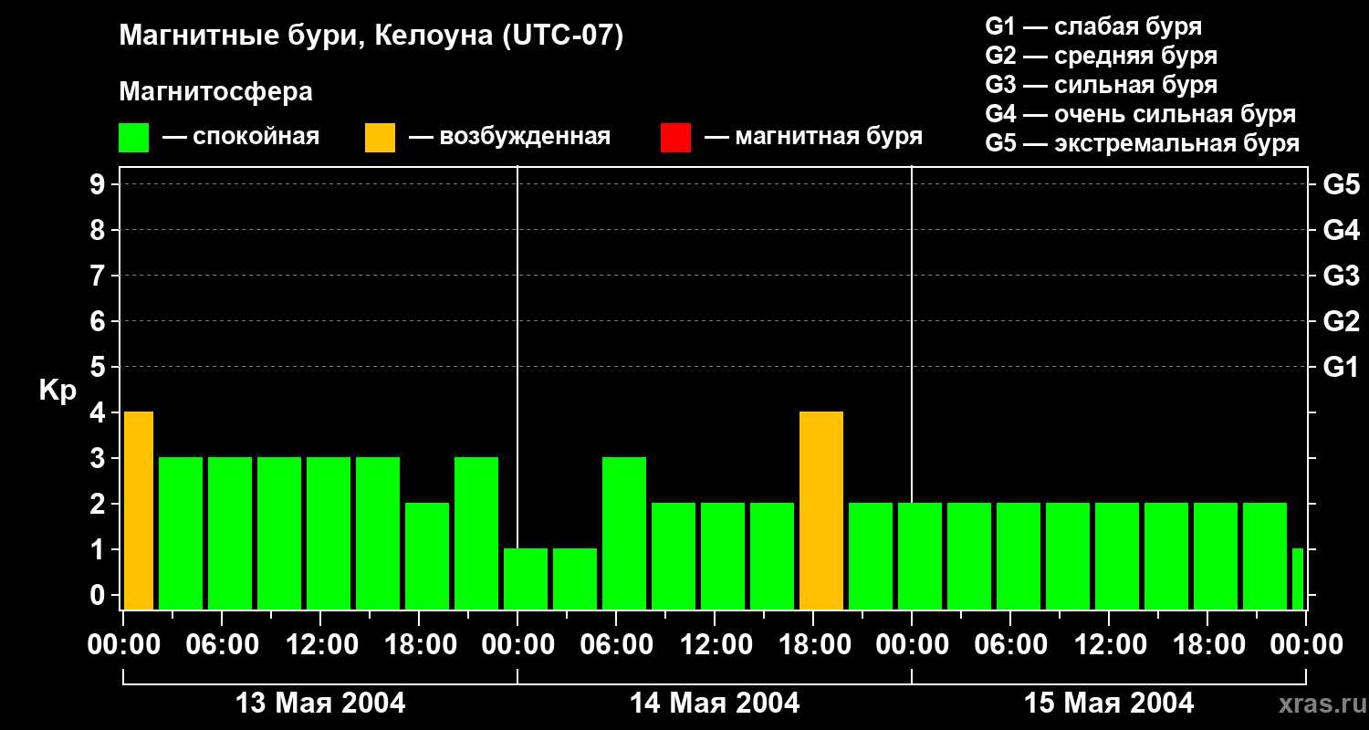 Изменения геомагнитного индекса Kp с 13 по 15 мая 2004 года для средних широт