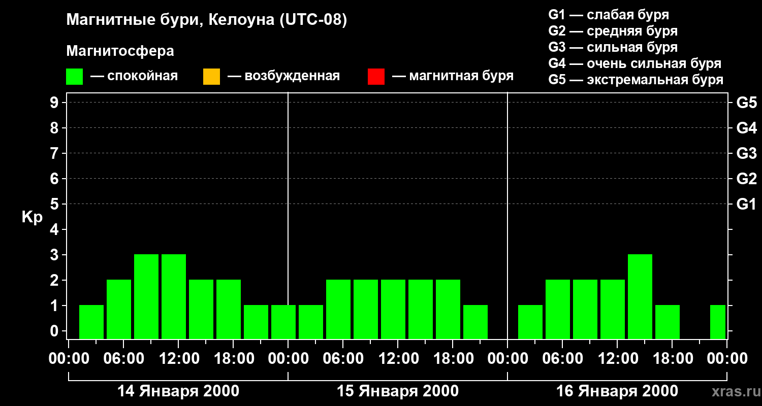 Изменения геомагнитного индекса Kp с 14 по 16 января 2000 года для средних широт
