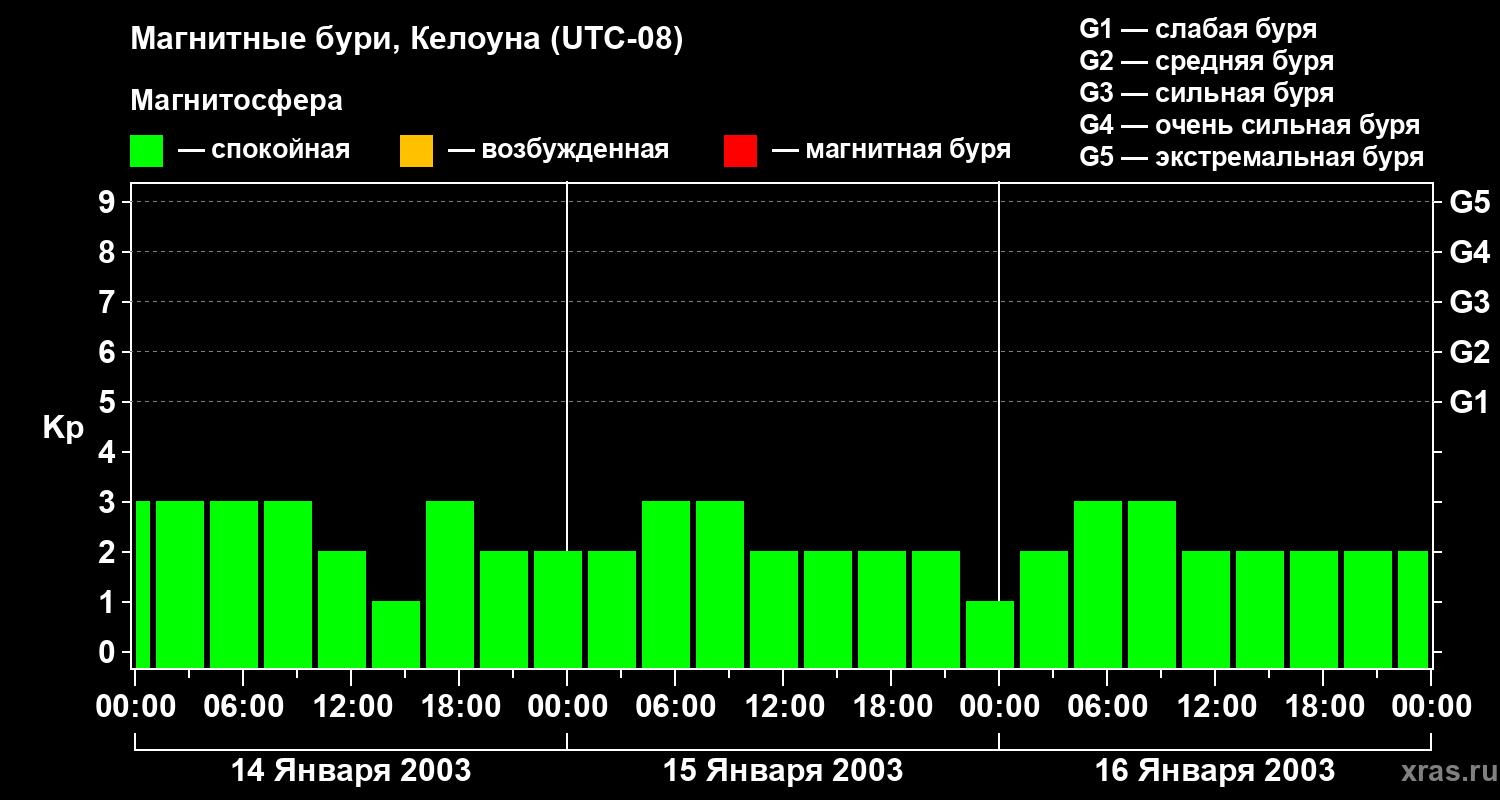 Изменения геомагнитного индекса Kp с 14 по 16 января 2003 года для средних широт