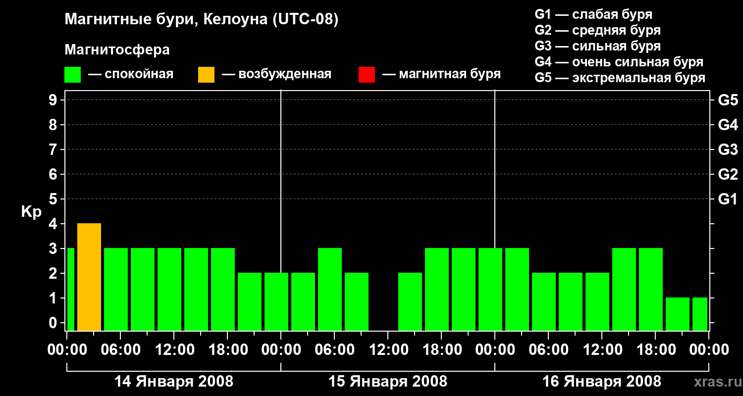 Изменения геомагнитного индекса Kp с 14 по 16 января 2008 года для средних широт