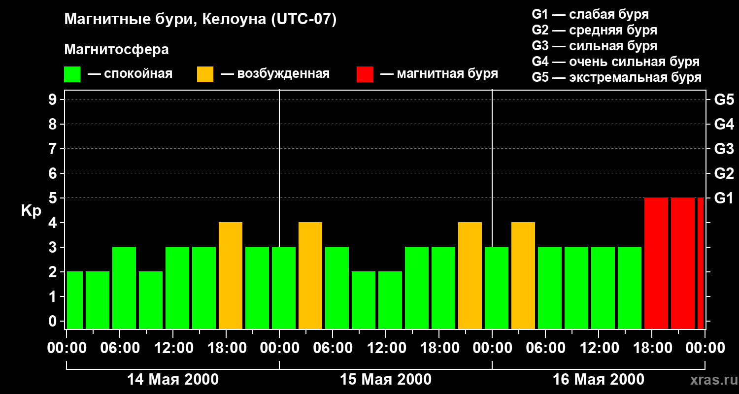 Изменения геомагнитного индекса Kp с 14 по 16 мая 2000 года для средних широт
