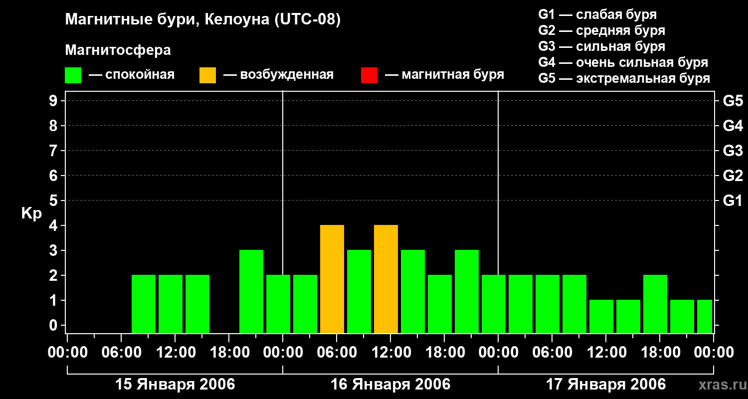 Изменения геомагнитного индекса Kp с 15 по 17 января 2006 года для средних широт