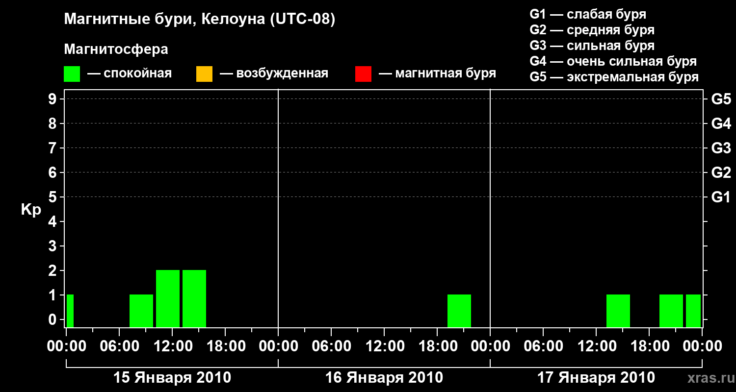 Изменения геомагнитного индекса Kp с 15 по 17 января 2010 года для средних широт