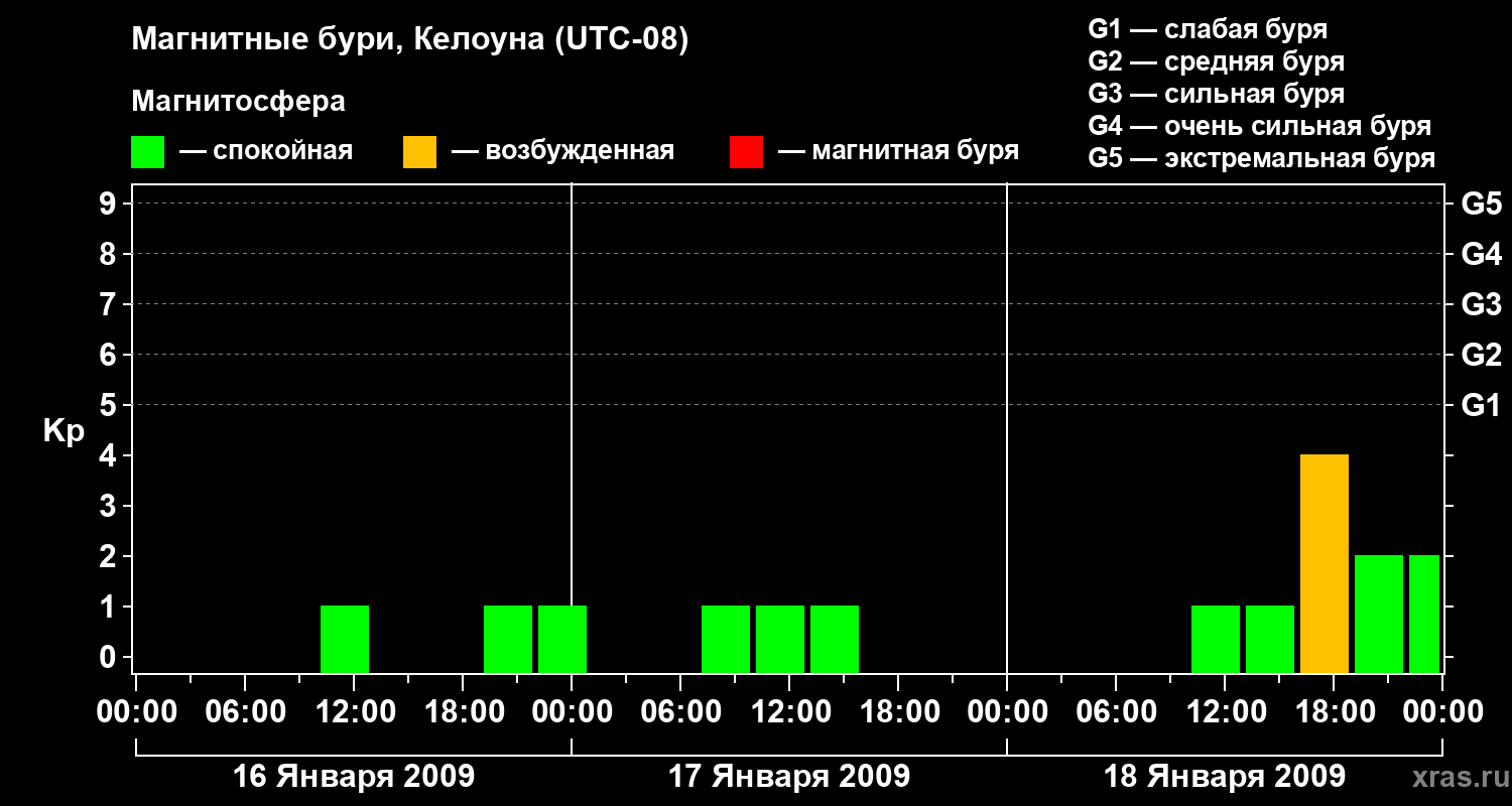Изменения геомагнитного индекса Kp с 16 по 18 января 2009 года для средних широт