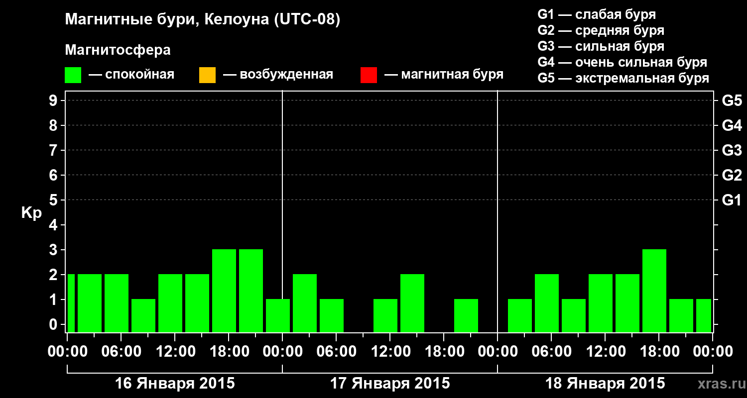 Изменения геомагнитного индекса Kp с 16 по 18 января 2015 года для средних широт