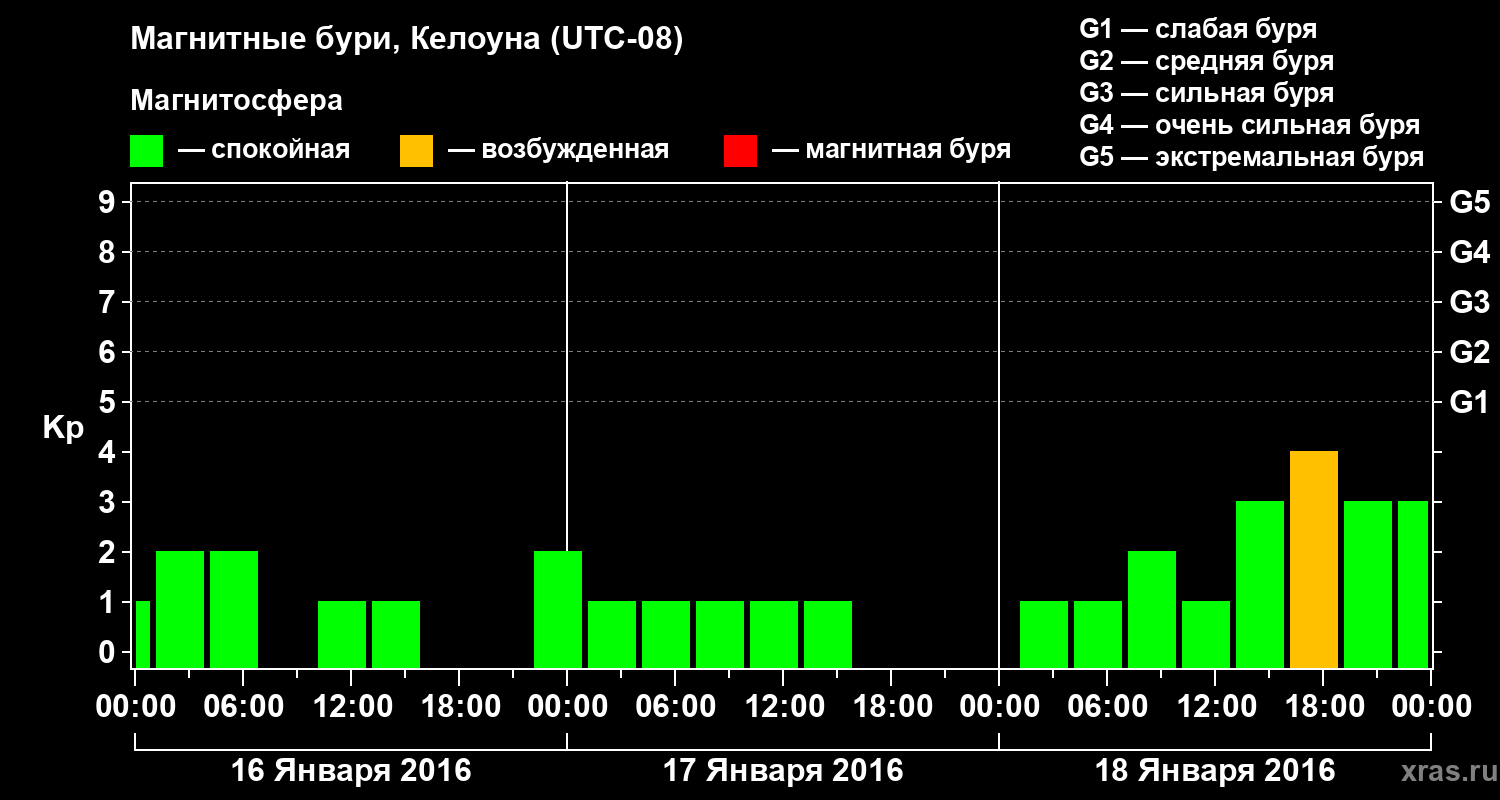 Изменения геомагнитного индекса Kp с 16 по 18 января 2016 года для средних широт