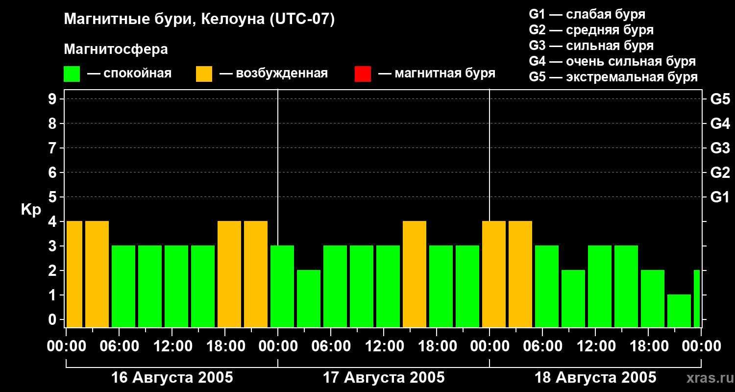 Изменения геомагнитного индекса Kp с 16 по 18 августа 2005 года для средних широт