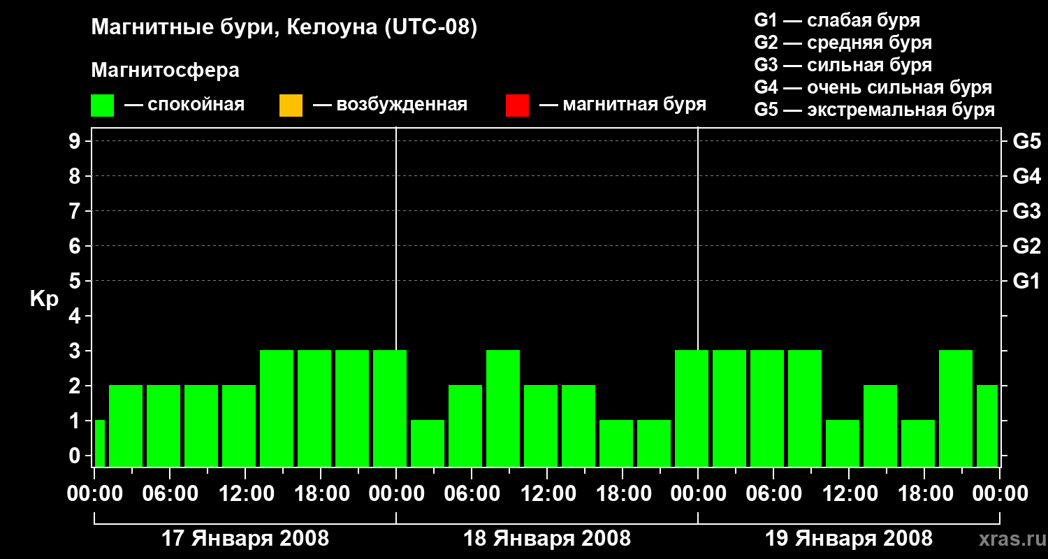 Изменения геомагнитного индекса Kp с 17 по 19 января 2008 года для средних широт