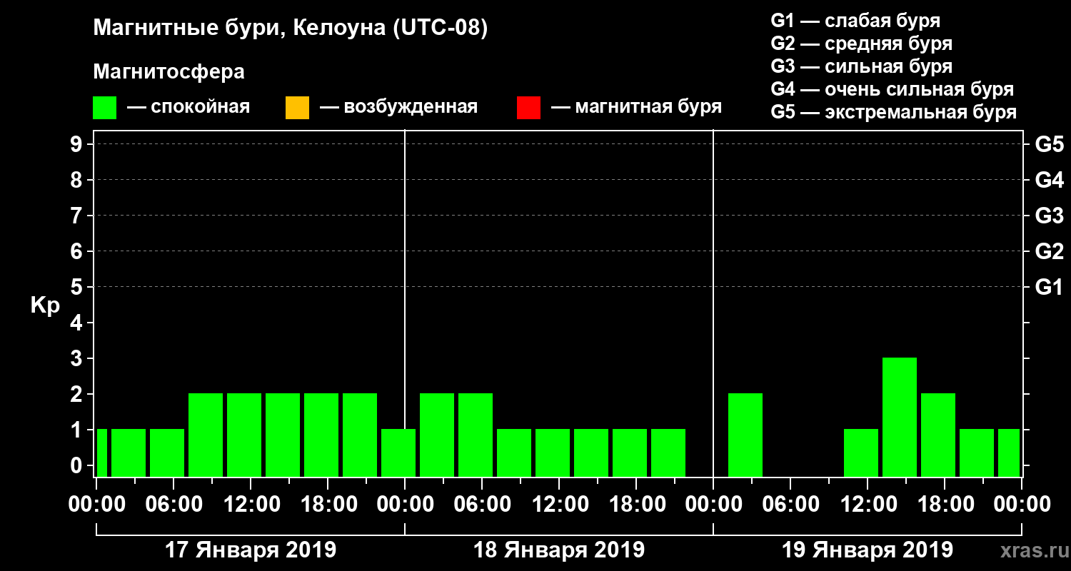Изменения геомагнитного индекса Kp с 17 по 19 января 2019 года для средних широт