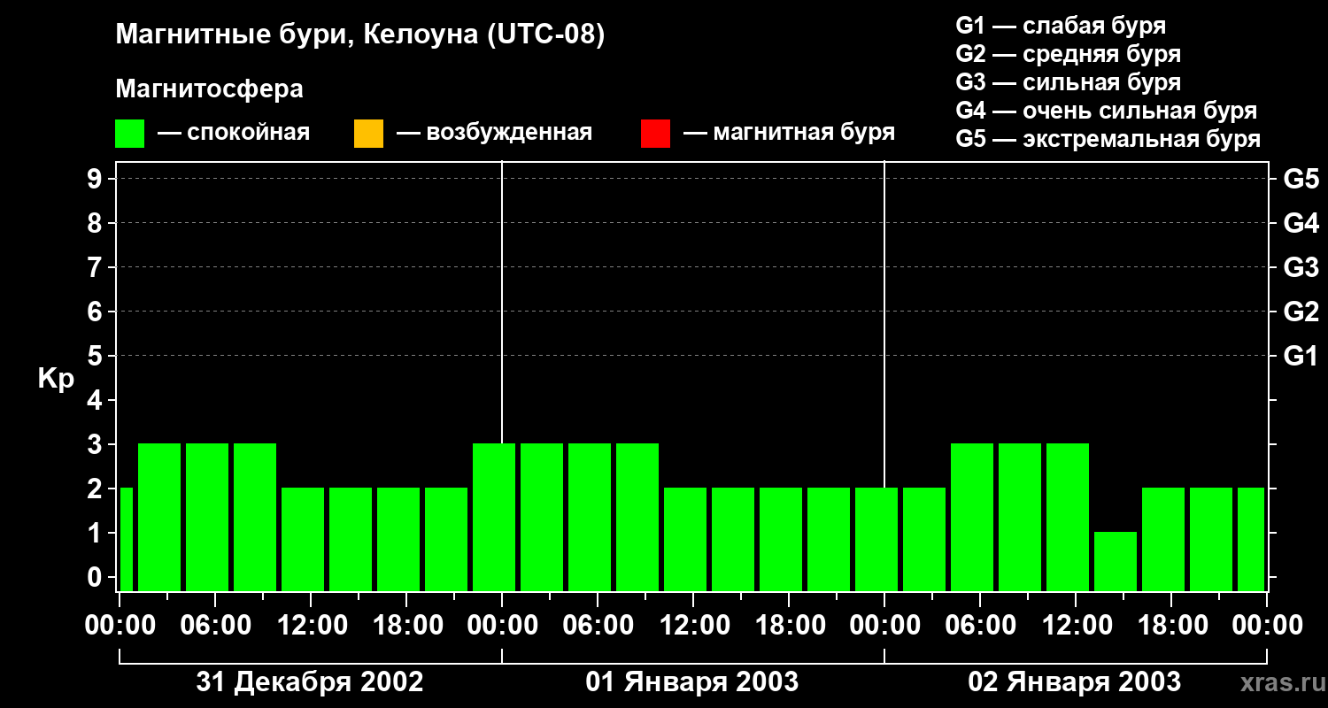 Изменения геомагнитного индекса Kp с 31 декабря 2002 года по 2 января 2003 года для средних широт