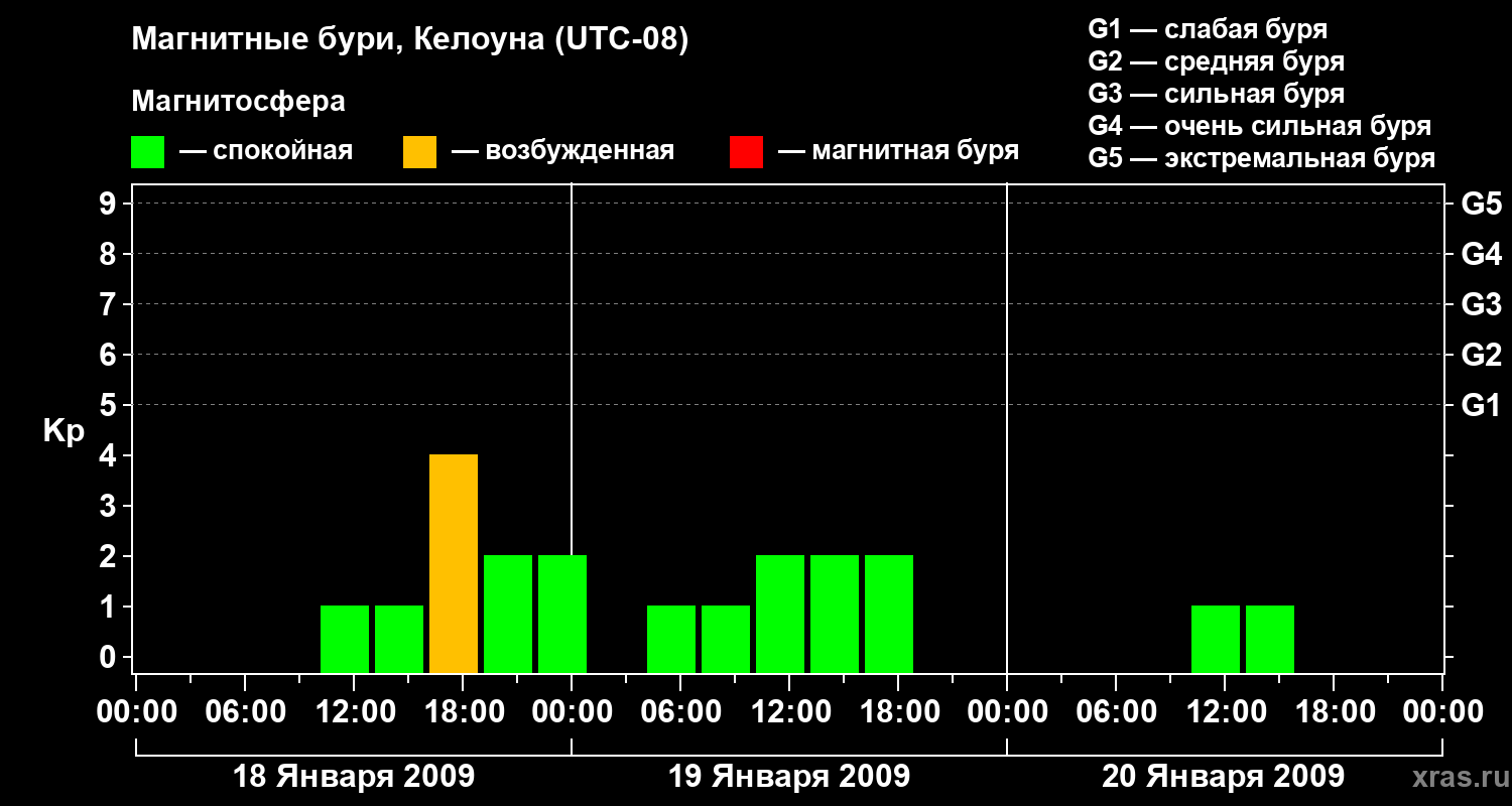 Изменения геомагнитного индекса Kp с 18 по 20 января 2009 года для средних широт