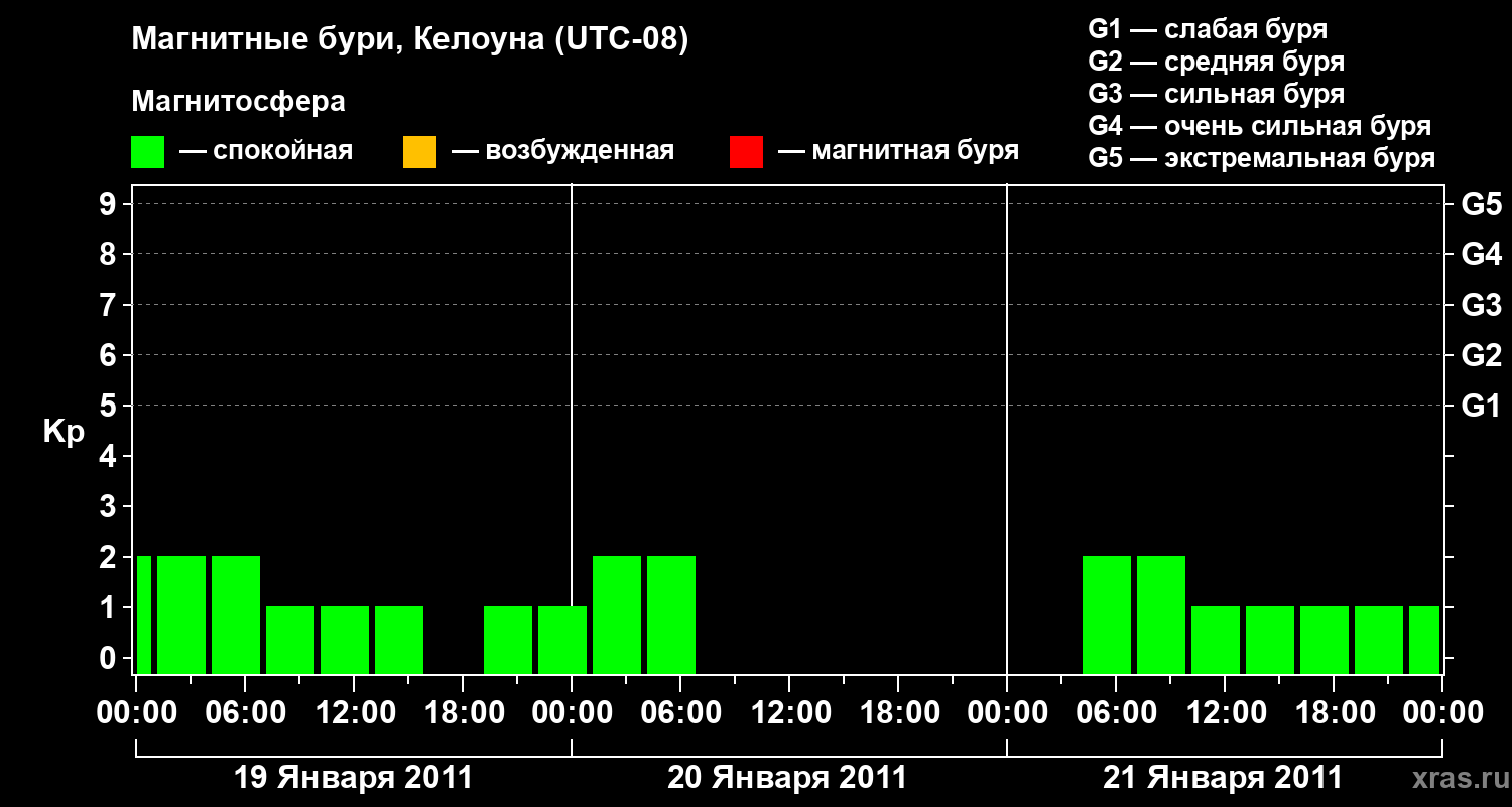 Изменения геомагнитного индекса Kp с 19 по 21 января 2011 года для средних широт