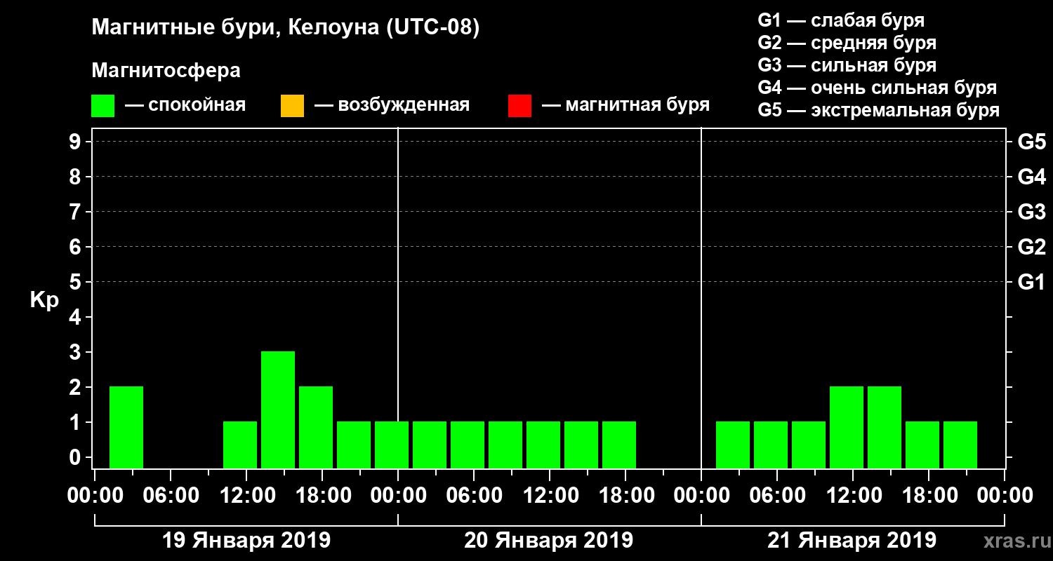 Изменения геомагнитного индекса Kp с 19 по 21 января 2019 года для средних широт