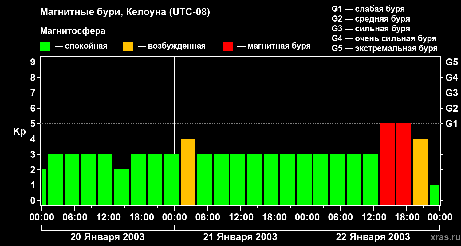 Изменения геомагнитного индекса Kp с 20 по 22 января 2003 года для средних широт