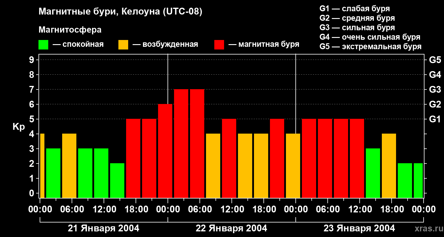 Изменения геомагнитного индекса Kp с 21 по 23 января 2004 года для средних широт