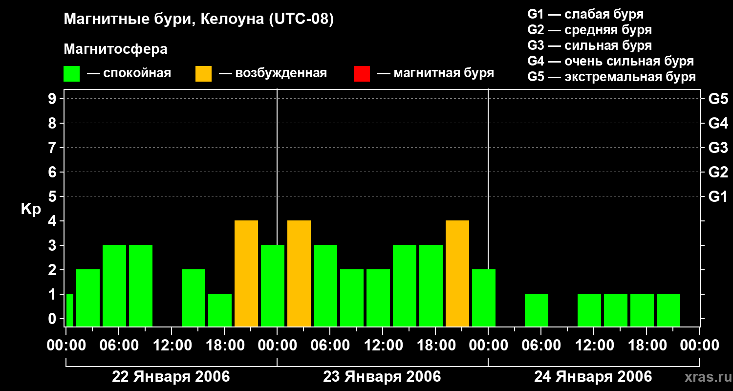 Изменения геомагнитного индекса Kp с 22 по 24 января 2006 года для средних широт