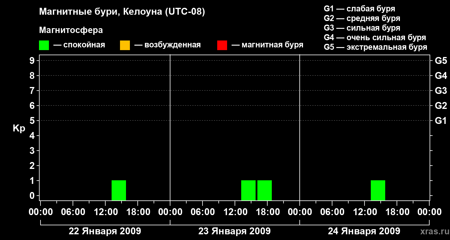 Изменения геомагнитного индекса Kp с 22 по 24 января 2009 года для средних широт