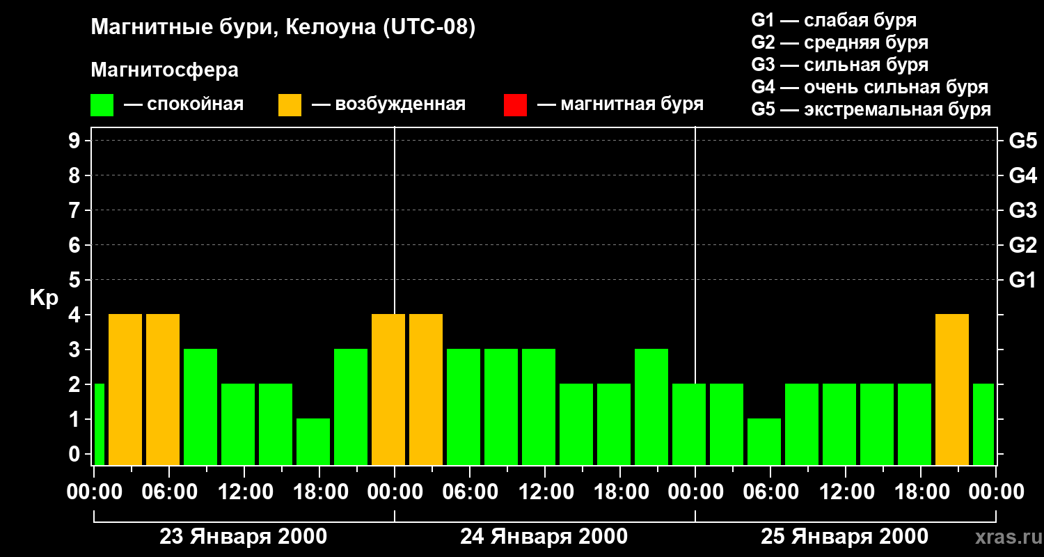 Изменения геомагнитного индекса Kp с 23 по 25 января 2000 года для средних широт