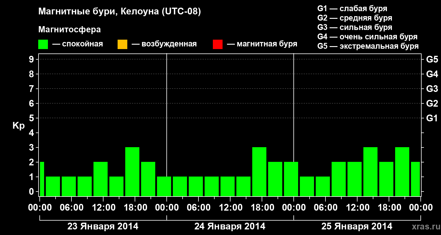 Изменения геомагнитного индекса Kp с 23 по 25 января 2014 года для средних широт