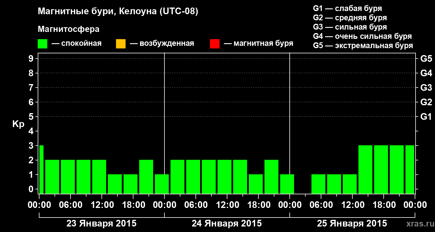 Изменения геомагнитного индекса Kp с 23 по 25 января 2015 года для средних широт