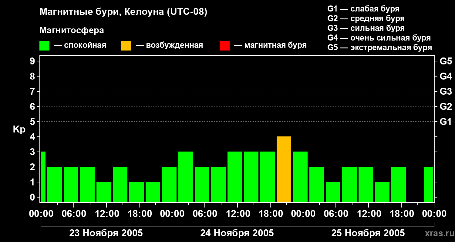 Изменения геомагнитного индекса Kp с 23 по 25 ноября 2005 года для средних широт