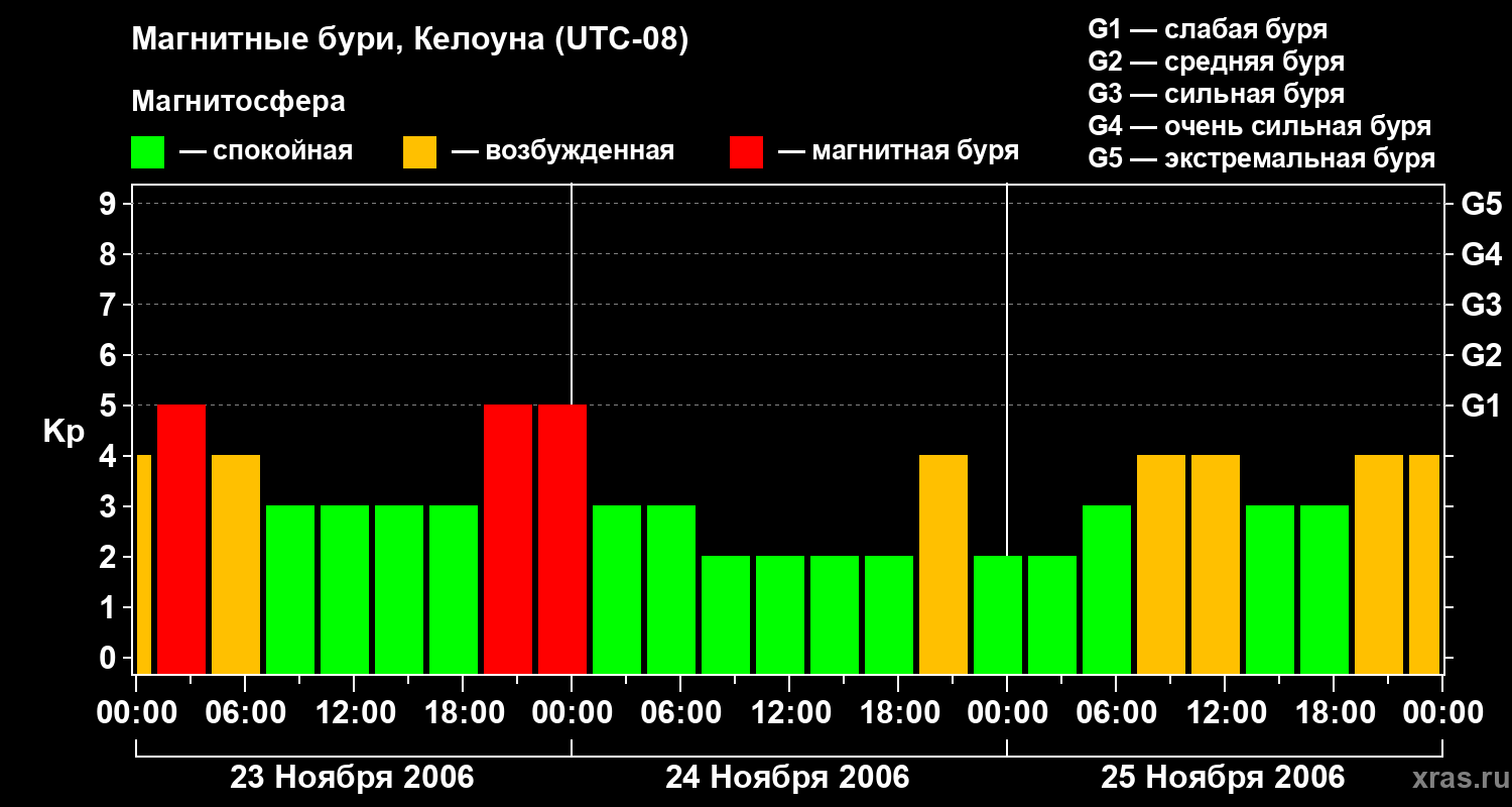 Изменения геомагнитного индекса Kp с 23 по 25 ноября 2006 года для средних широт