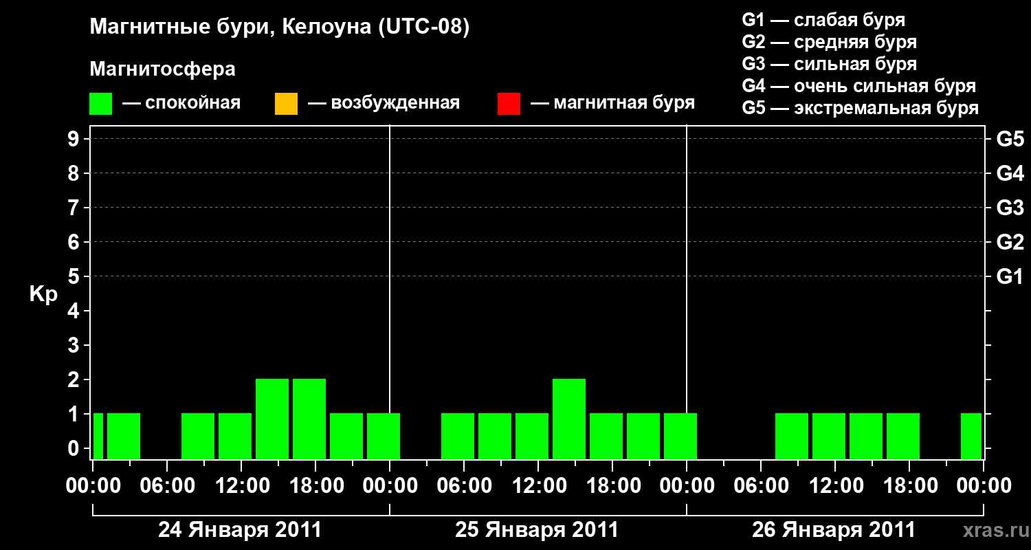 Изменения геомагнитного индекса Kp с 24 по 26 января 2011 года для средних широт