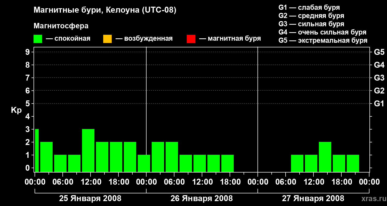 Изменения геомагнитного индекса Kp с 25 по 27 января 2008 года для средних широт