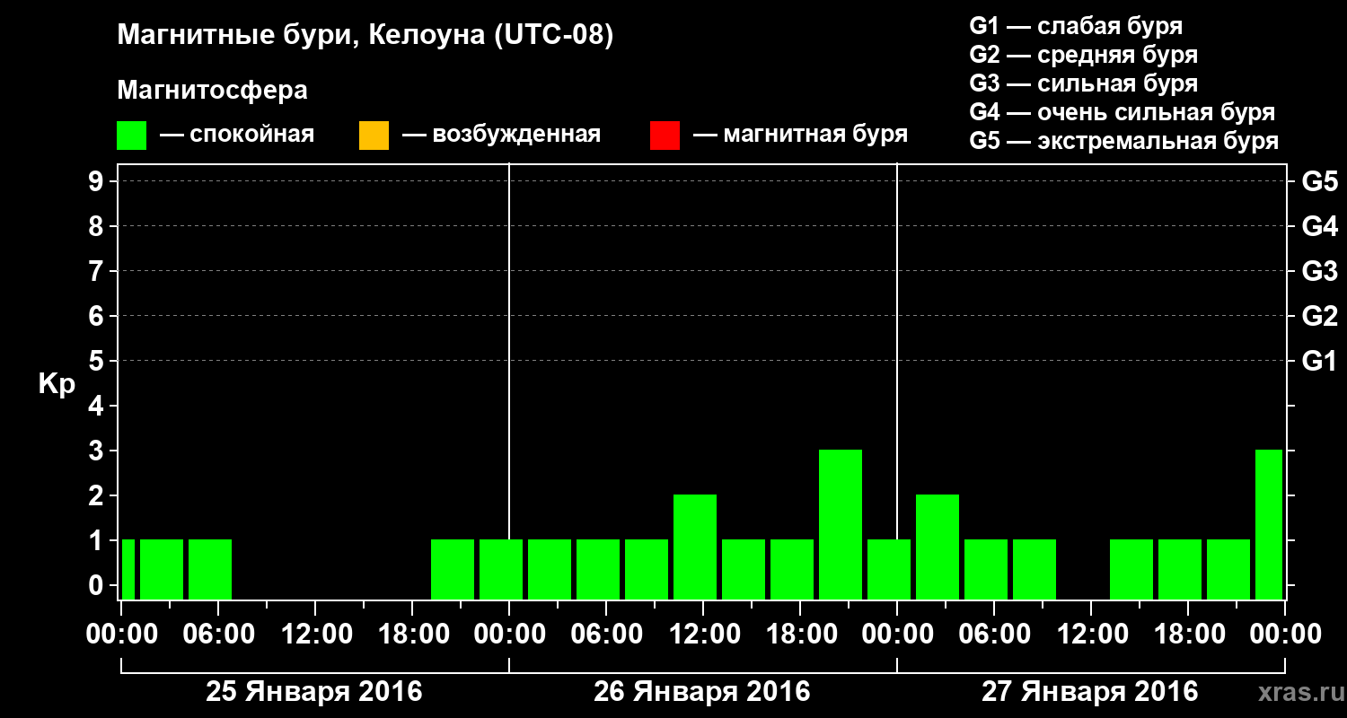 Изменения геомагнитного индекса Kp с 25 по 27 января 2016 года для средних широт