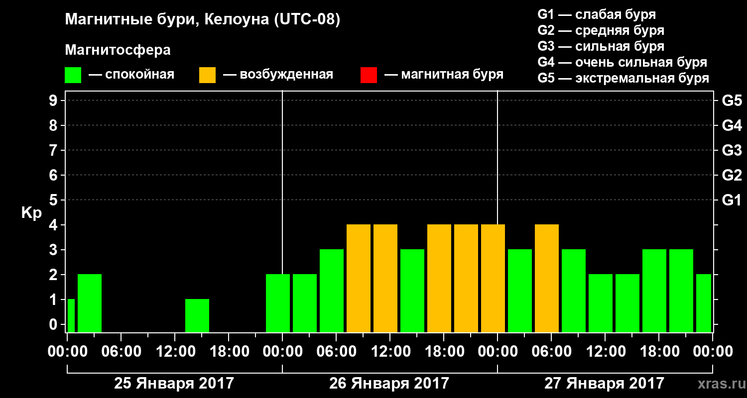 Изменения геомагнитного индекса Kp с 25 по 27 января 2017 года для средних широт
