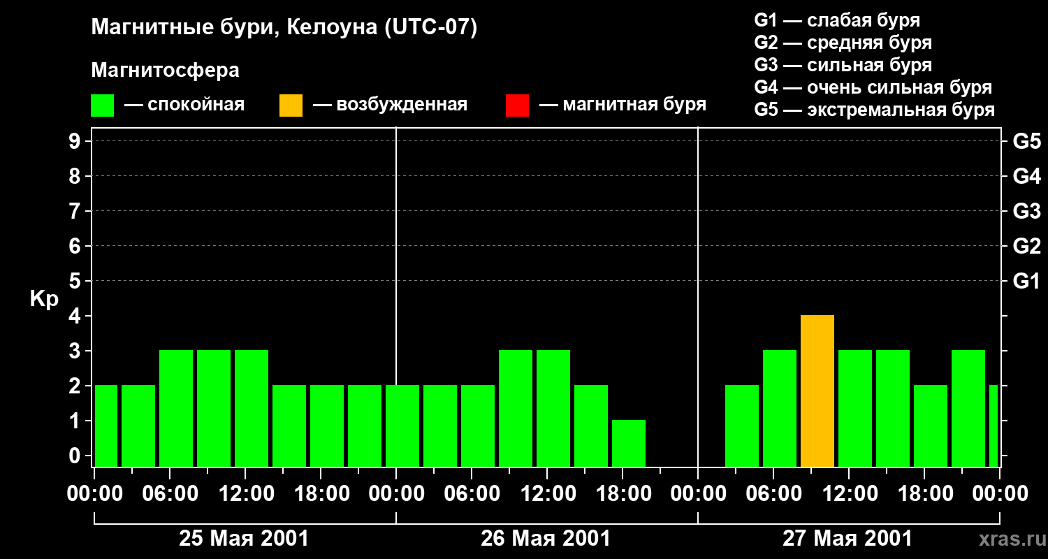 Изменения геомагнитного индекса Kp с 25 по 27 мая 2001 года для средних широт
