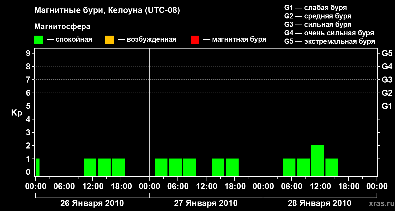 Изменения геомагнитного индекса Kp с 26 по 28 января 2010 года для средних широт