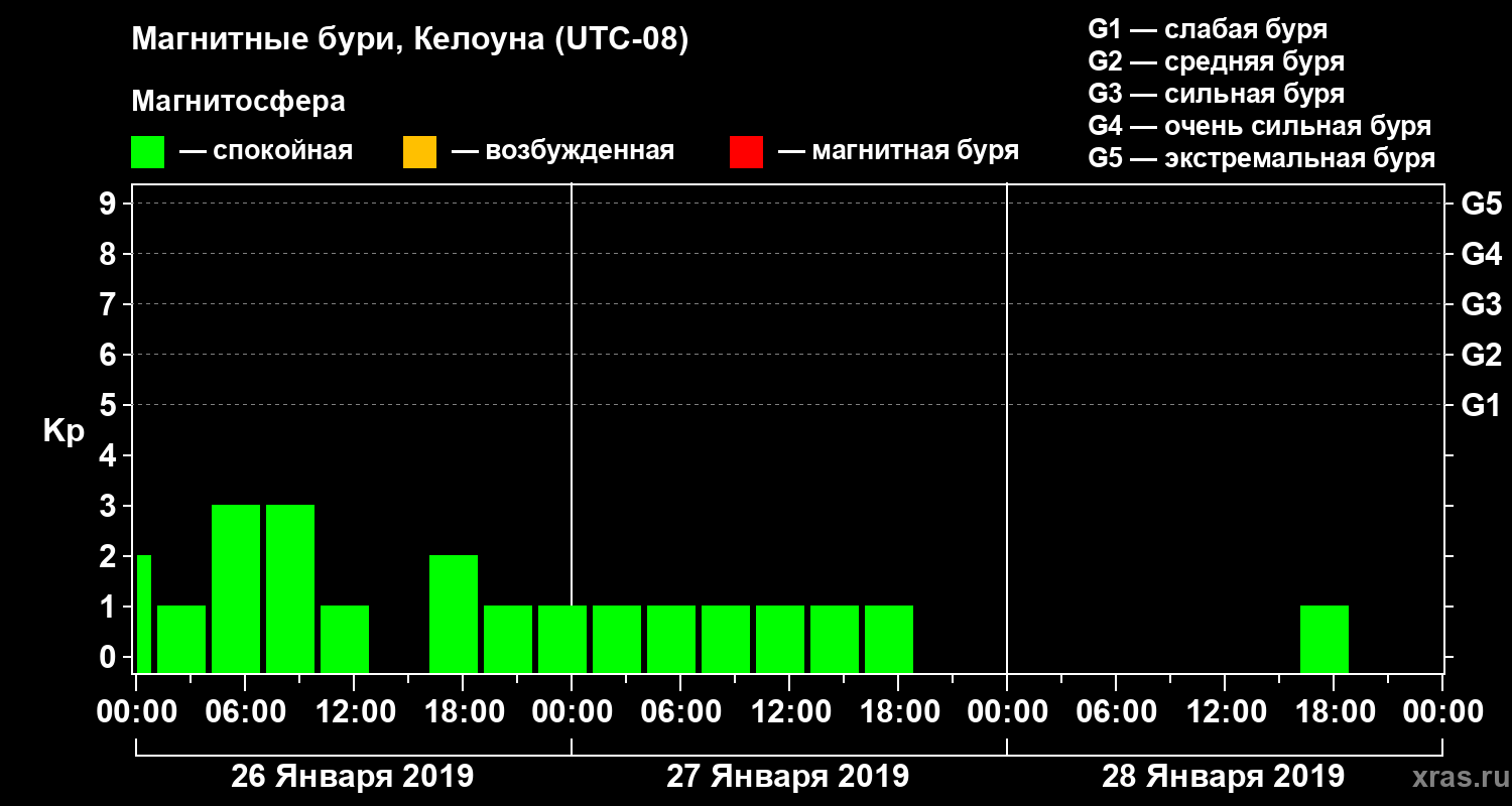 Изменения геомагнитного индекса Kp с 26 по 28 января 2019 года для средних широт