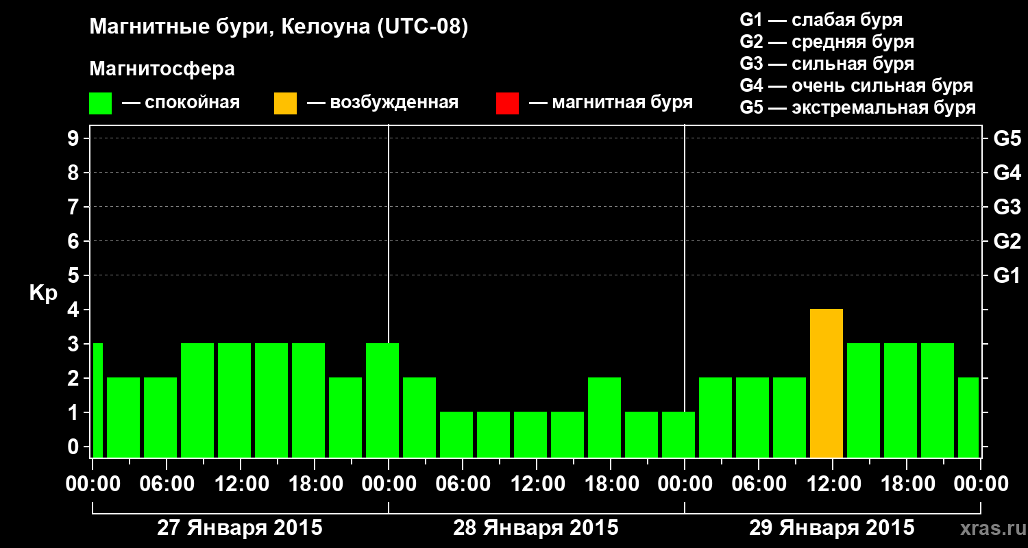 Изменения геомагнитного индекса Kp с 27 по 29 января 2015 года для средних широт