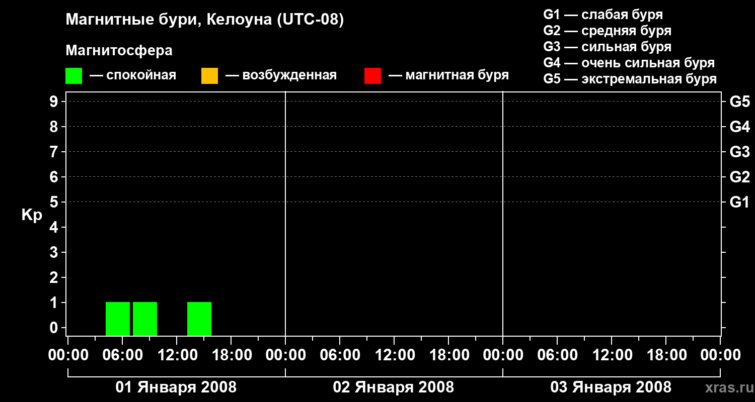 Изменения геомагнитного индекса Kp с 1 по 3 января 2008 года для средних широт
