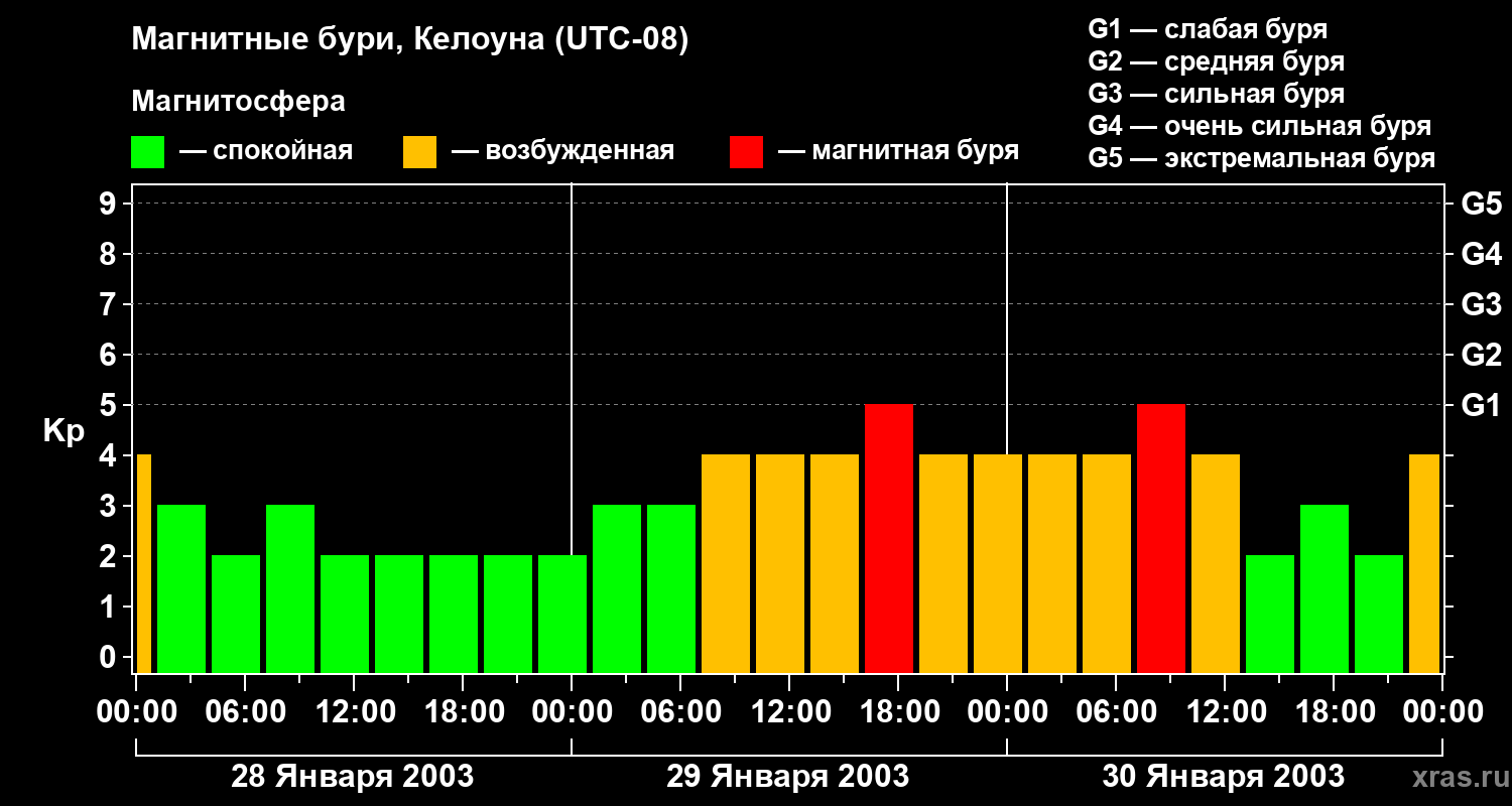 Изменения геомагнитного индекса Kp с 28 по 30 января 2003 года для средних широт