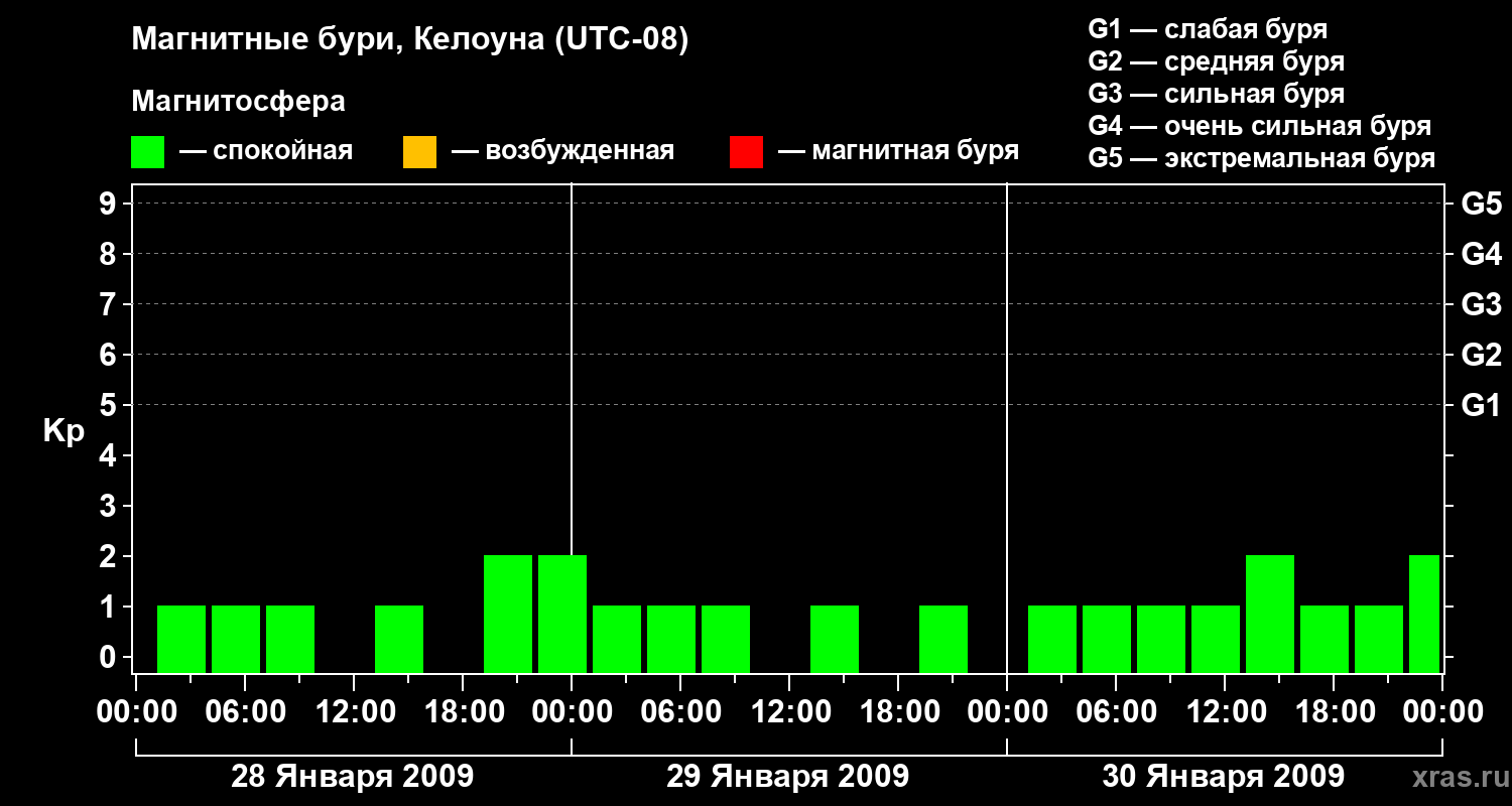 Изменения геомагнитного индекса Kp с 28 по 30 января 2009 года для средних широт