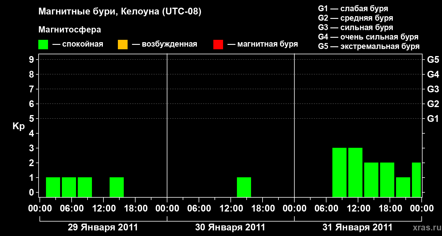 Изменения геомагнитного индекса Kp с 29 по 31 января 2011 года для средних широт