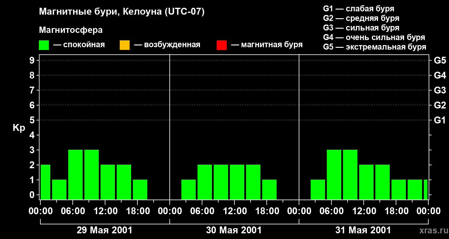 Изменения геомагнитного индекса Kp с 29 по 31 мая 2001 года для средних широт