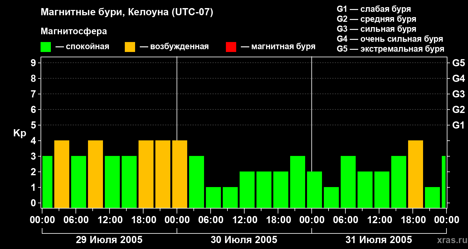 Изменения геомагнитного индекса Kp с 29 по 31 июля 2005 года для средних широт